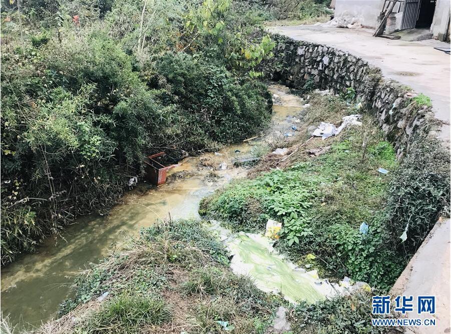 在東南沿海某省村莊中,穿村小河水體呈黑褐色,水面漂浮大量生活垃圾(11月27日攝)。新華社記者 閆紅心 攝